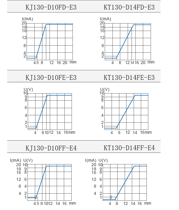 | 備注: 1.其它技術數據可向我們詢問。 2.各種模擬傳感器標準檢測體接近感應面,在規定的條件下,它們的可使用距離與輸出電流成比例,各曲線詳見備曲線圖。 ![]() | ||||