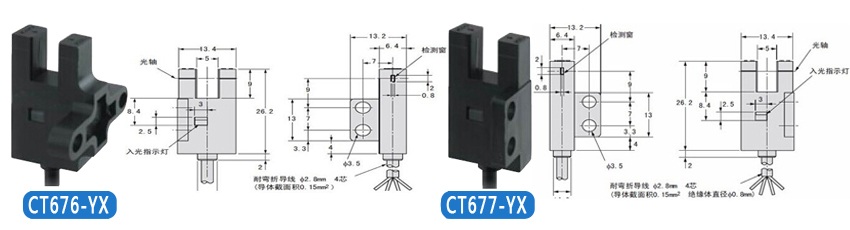 | KJT-CT671-YX 控制輸出 | 受光時紅色指示燈亮,NPN集電極無輸出;遮光時紅色指示燈滅,NPN集電極開路輸出DC5V--24V 、 100mA以下,殘留電壓0.5V以下(負荷電流100mA時)、殘留電壓0.3V以下(負荷電流40mA時) |